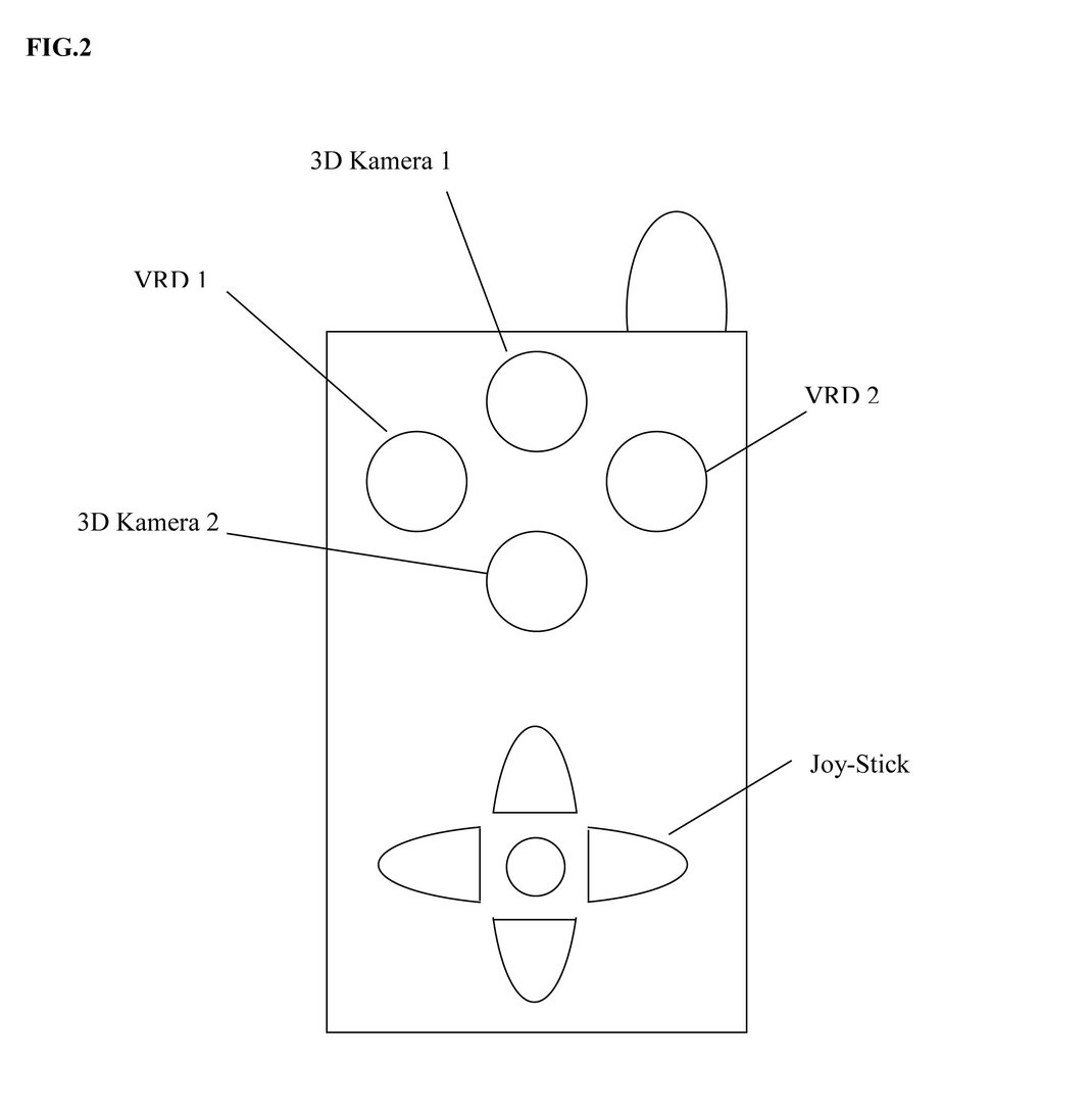Heutig Mobiltelefone und Personal Digital Assistants verfügen – wenn überhaupt - nur über konventionelle 2D-Kameras. Damit der Benutzer die Bilder auch in 3D betrachten kann, müssen sie zuerst mit speziellen 3D-Kameras aufgezeichnet werden. Zu den wenigen Verfahren, die keine Brille zur Betrachtung von 3D-Bildern benötigen gehört das sogenannte autostereoskopische Verfahren. Hierbei wird die Tiefenwahrnehmung durch den „Wechsel der Bedeckung ferner Gegenstände durch nähere“ erzeugt. Näher beschrieben bedeutet dies, dass der Tiefeneindruck beim diesem Verfahren dadurch entsteht, dass entfernte Gegenstände – wie bei der echten Wahrnehmung – bei wechselseitiger Betrachtung von linkem bzw. rechtem Auge, ihren Ort kaum zu ändern scheinen, wobei nahe Gegenstände ihren Ort sprunghaft nach rechts bzw. links zu ändern scheinen. Liefert der Bildschirm dem Gehirn diese zwei Perspektiven in einer bestimmten optimalen Frequenz, so bekommt das zweidimensionale Bild einen Tiefeneindruck. Das Motiv wird aus zwei unterschiedlichen Blickwinkeln aufgenommen. Die zwei Teilbilder können dabei mit vertikaler oder mit horizontaler Verschiebung aufgenommen werden. Das heisst, die beiden Videokameras können vertikal oder horizontal angeordnet werden. Benötigten Benutzer mit Augenkorrektur für das herkömmliche Ablesen eines Bildschirms noch eine Sehhilfe oder Brille, so wirkt die VRD Methode für Sehbehinderte (Kurz- oder Langsichtigkeit) selbstkorrigierend, da der Photonenstrahl die Bilder direkt auf die Retina projiziert. Ein weiterer Vorteil der VRD Methode sind die relativ niedrigen Kosten und der tiefe Stromverbrauch im Vergleich zu konventionellen Displays. Eine äusserst geringe Laserleistung (79nW) der koheränten Strahlung ist erforderlich, um einen sehr hellen Bildeindruck zu erzeugen. Dieser Vorteil ist vor allem bei starkem Sonnenlicht eklatant. Während LCD Displays schon bei normalem Sonnenlicht schlecht oder überhaupt nicht lesbar sind, erzeugen VRD-Systeme noch bei stärkster Sonneneinstrahlung gestochen scharfe Bilder auf der Netzhaut. Über das sogenannte Eye-Tracking System, das den Augenbewegungen des Benutzers folgen kann, wird der Laserstrahl jederzeit automatisch richtig auf der Retina positioniert. Die Audio-, Video- und Daten Kommunikation zwischen zwei oder mehreren Benutzern oder externen Computersystemen und Peripheriegeräten erfolgt über ein oder mehrere integrierte Kommunikationsmodule. Die Datenübertragung kann vorzugsweise über ein Funknetz wie bspw. Bluetooth, Wireless Lan, GSM (Global System for Mobile Communication), GPRS (General Packet Radio System), EDGE (Enhanced Data rates for GSM Evolution), UMTS (Universal Mobile Telecommunications System) und über sogenannte 4G (fourth Generation) oder 5G (fifth Generation ) Systeme mit 20-100 Mb/s Übertragungsgeschwindigkeit oder durch andere Übertragungseinrichtungen – bspw. Satelliten erfolgen. Das elektronische Gerät ist mit einem oder mehreren SIM-Karten-Lesern (subscriber identity module) ausgerüstet. Die SIM-Karte ist eine scheckkartengroße Identifizierungskarte für den Teilnehmer eines GSM-Mobilfunkdienstes (GSM, GPRS, UMTS, etc.) und wird im allgemeinen als »Chipkarte« oder »Smart Card« bezeichnet. Diese Karten gibt es für Autotelefone und in verkleinerter Version auch für Handys. Bedingt durch die ständige Verkleinerung der Handies wird bei den meisten Handies nur noch der Chip benutzt. Er kann zu diesem Zweck von der SIM-Karte entfernt und in das Handy eingebaut werden. Die SIM Karte bzw. dessen Chip enthält teilnehmerrelevante Daten und Algorithmen sowie die Zugangsberechtigung zum Netz. U.a. befinden sich auf der SIM-Karte die internationale Teilnehmernummer IMSI (international mobile subscriber identity), die internationale Identifikationsnummer für das Mobilgerät IMEI (international mobile equipment identity), die